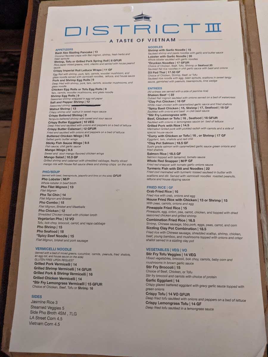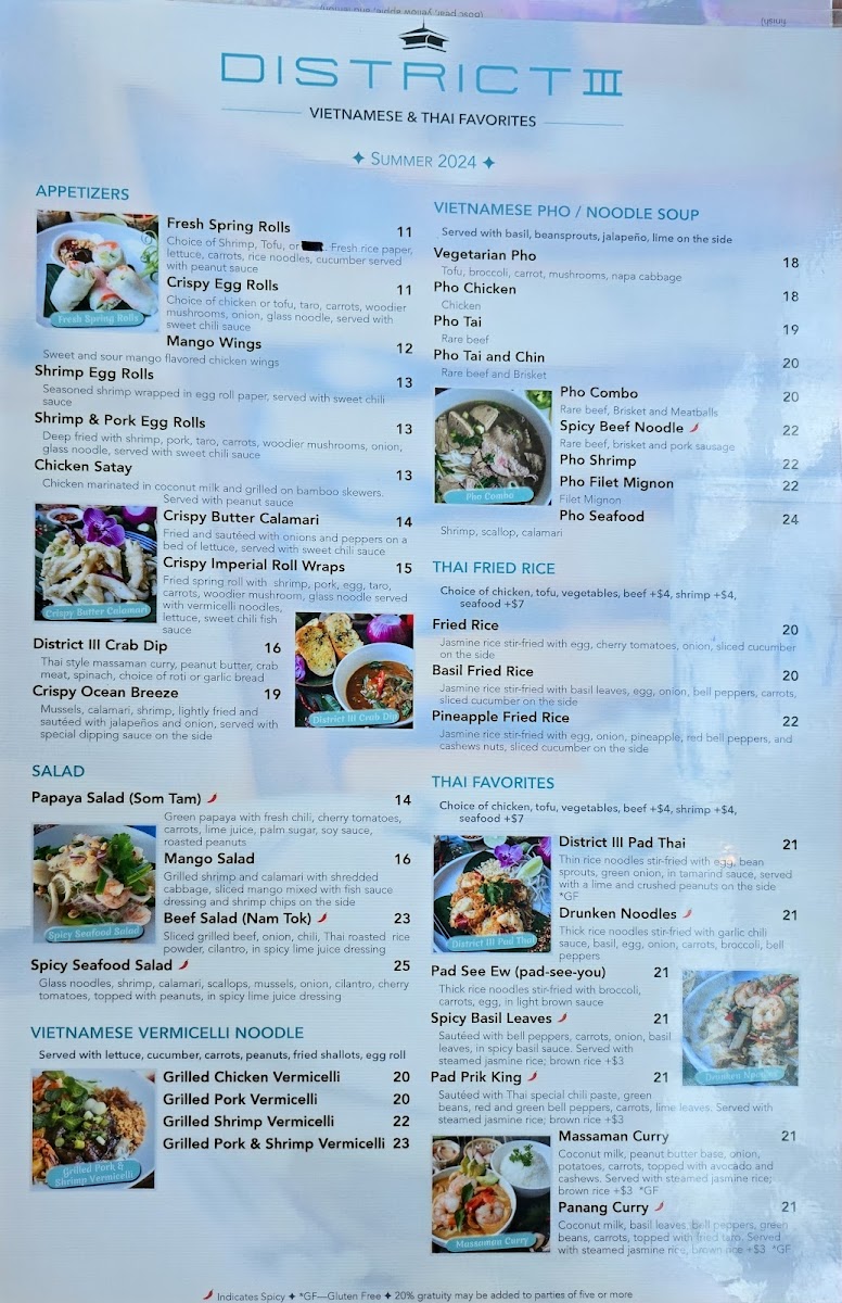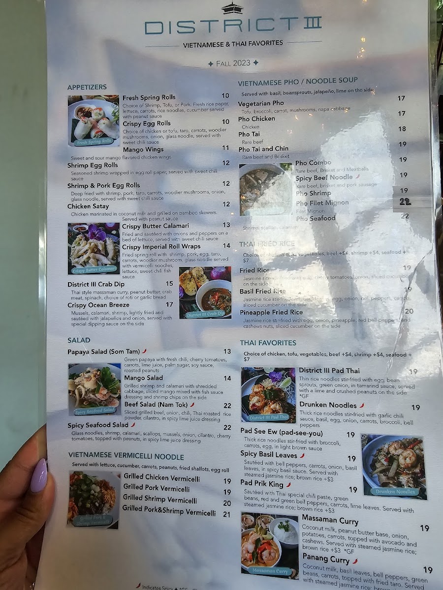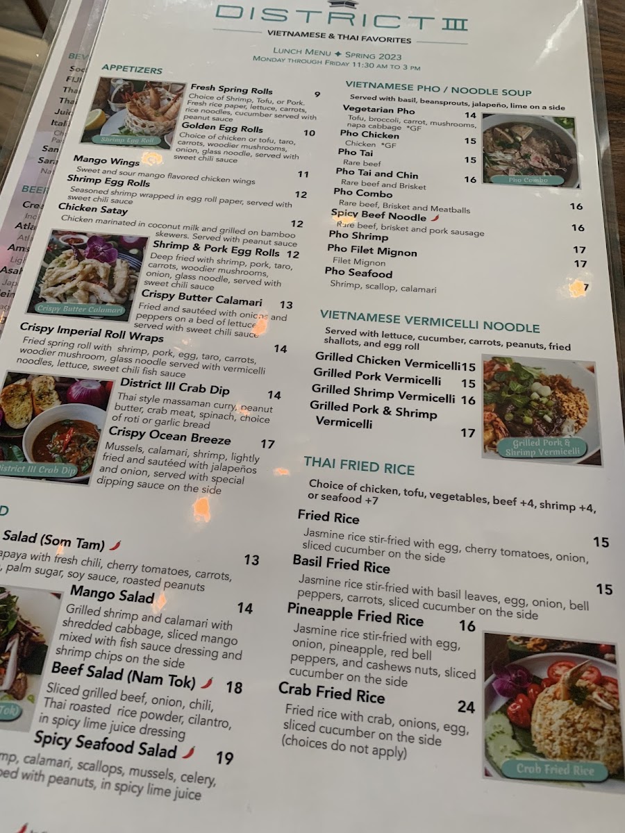 The menu at District III offers a thoughtfully curated selection that balances Vietnamese and Thai flavors with an emphasis on fresh seafood and traditional dishes. It’s the kind of menu that suits both casual weekday lunches and relaxed dinners with friends or family, blending comforting classics with vibrant, well-spiced plates.