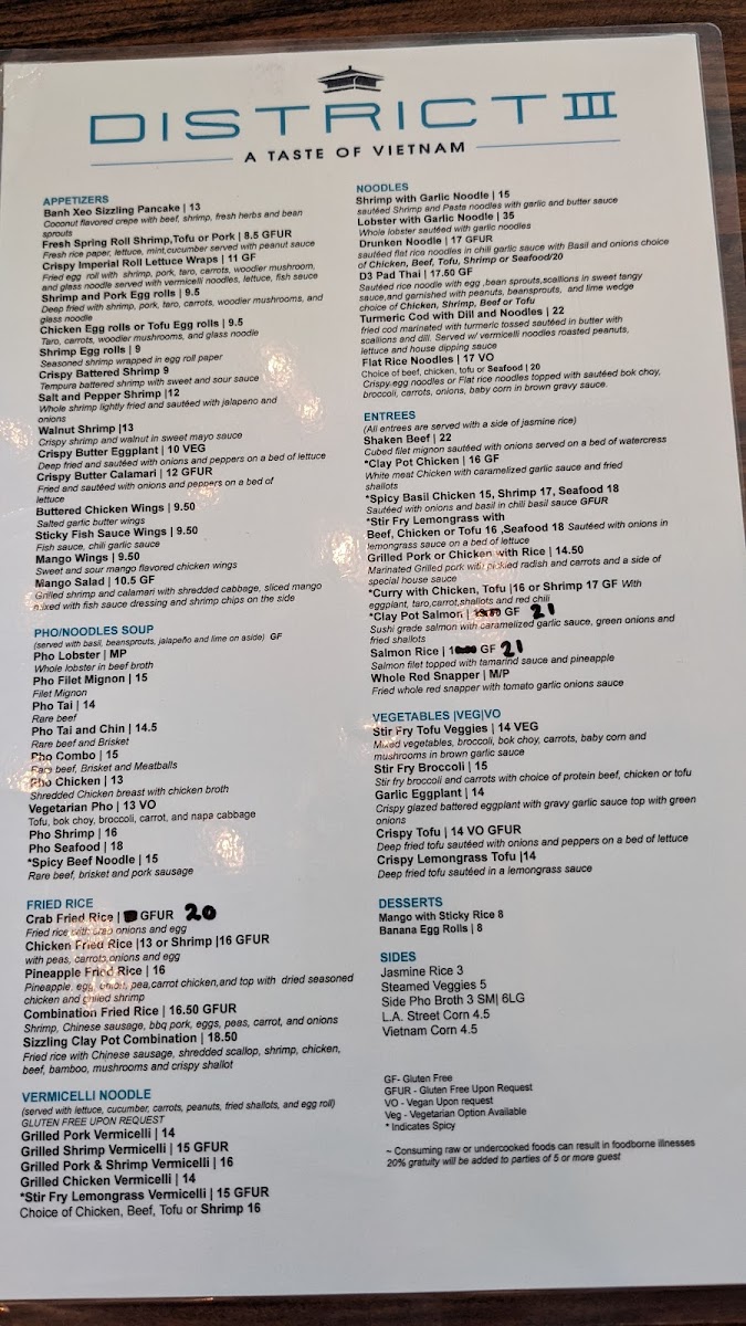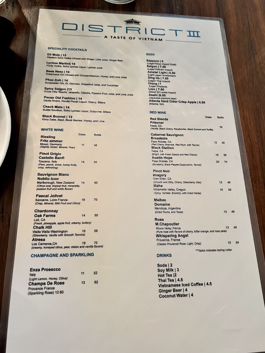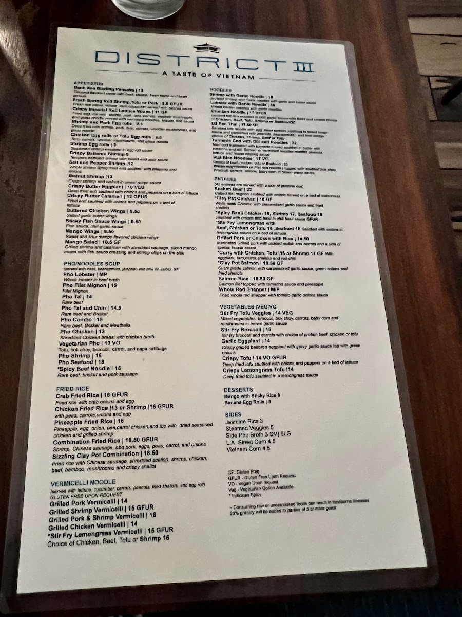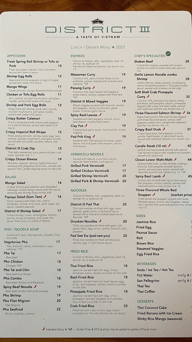 The menu at District III offers a thoughtfully curated selection that balances Vietnamese and Thai flavors with an emphasis on fresh seafood and traditional dishes. It’s the kind of menu that suits both casual weekday lunches and relaxed dinners with friends or family, blending comforting classics with vibrant, well-spiced plates.